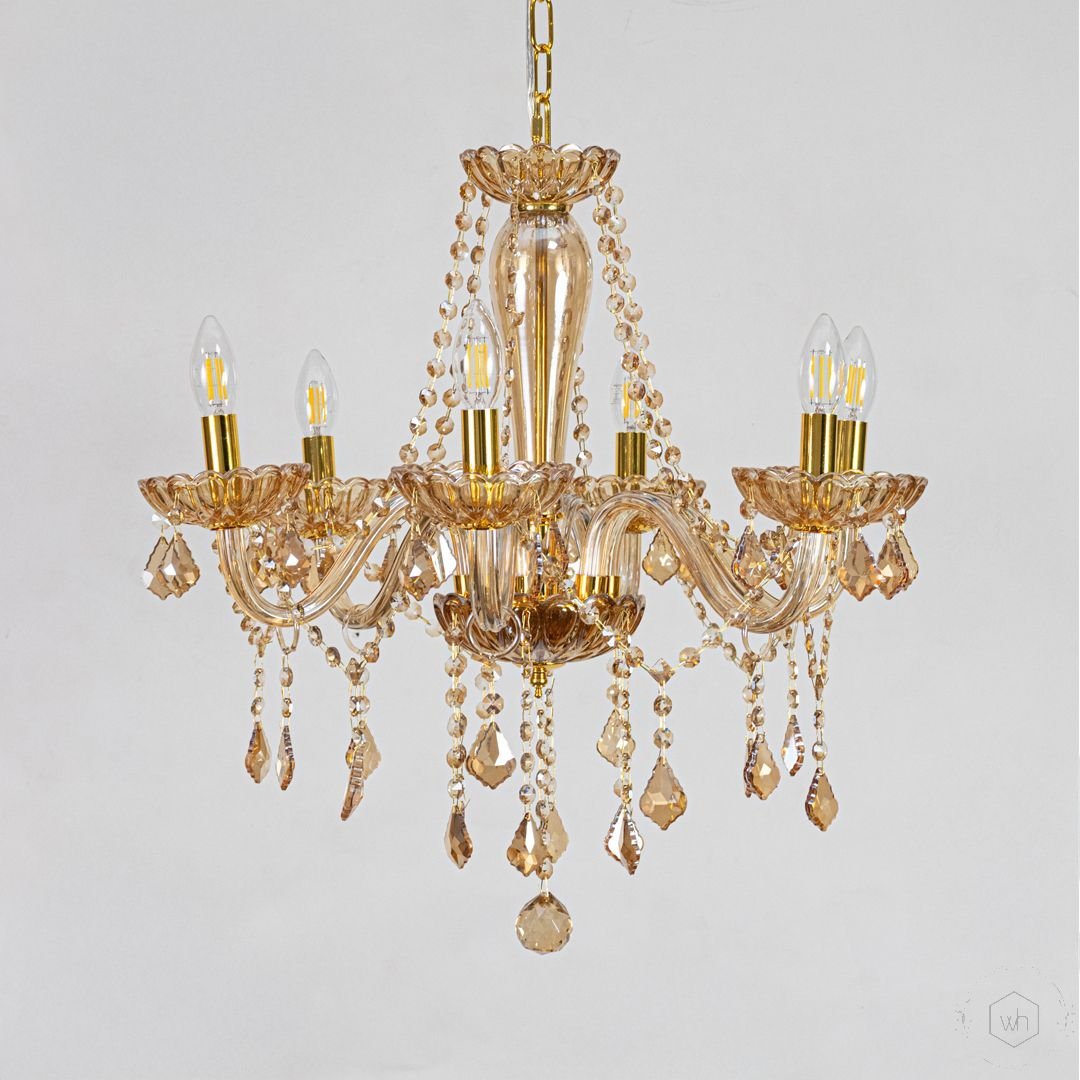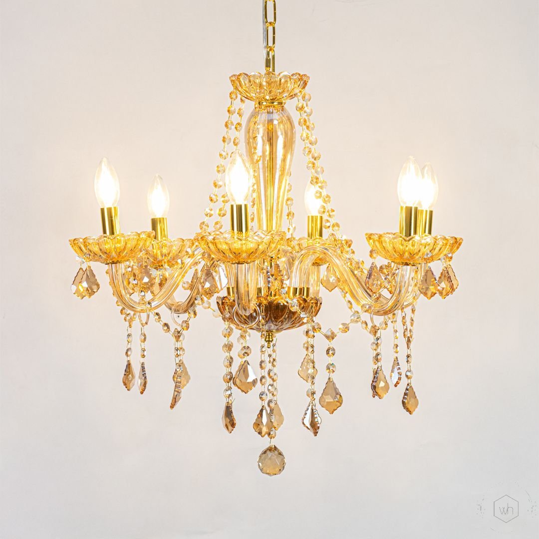 The Aurelia 6-Light Crystal Chandelier is a luxurious statement piece crafted with amber-toned glass arms, sparkling crystal droplets, and a premium metal frame. Designed to create warm, radiant illumination, it adds a touch of classic elegance and grandeur to any interior.
