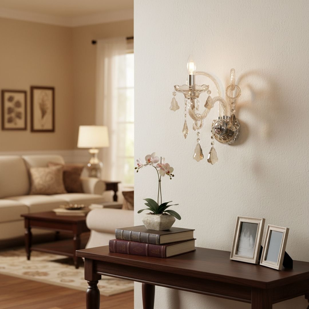 The Eclipse 1-Light Wall Sconce in Chrome combines modern brilliance with classic charm. Crafted with a polished metal frame, curved glass arm, and shimmering crystal droplets, it creates a warm, elegant glow that enhances any contemporary or traditional interior space.