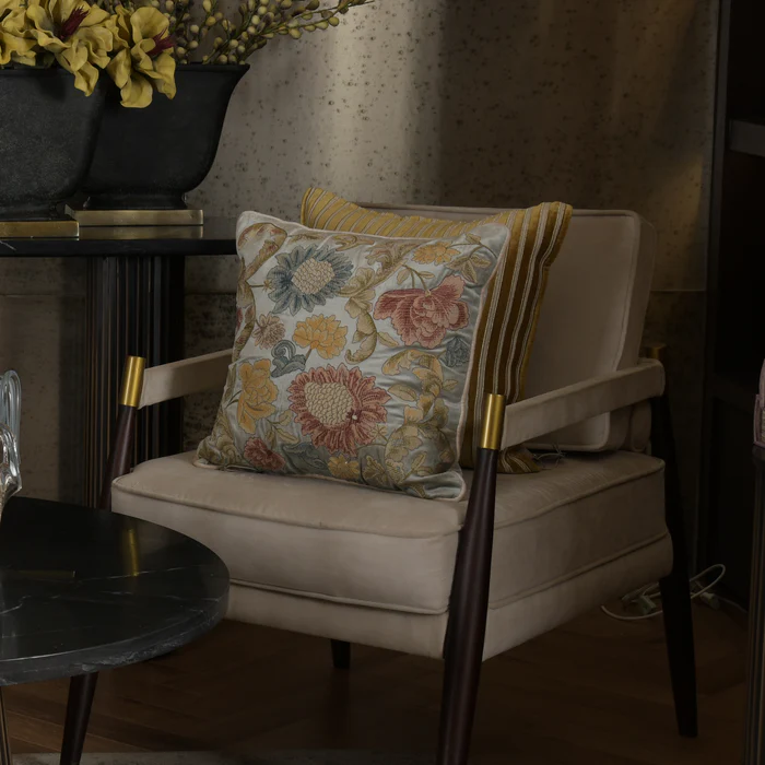 An ode to timeless craftsmanship, our Emma Cushion Cover brings opulence to modern living. Crafted in lustrous velvet, it features exquisite multicolour floral embroidery inspired by classic European tapestries. The soothing light green base beautifully complements the vibrant threadwork in shades of ochre, teal, and crimson, while the plush velvet back adds a touch of indulgent comfort. Perfect for adding a refined, artistic charm to your interiors.