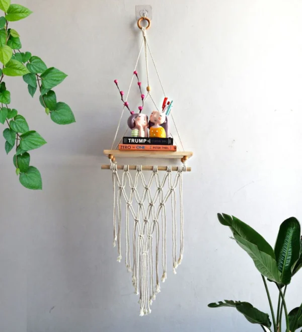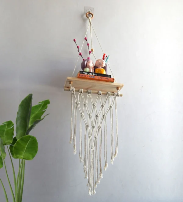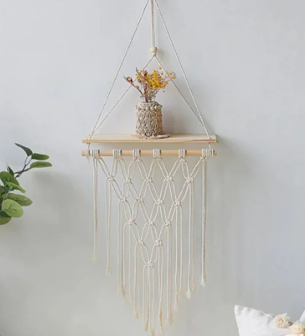 Handmade Macrame Wall Hanging with Pine Wood Shelf in Off-White