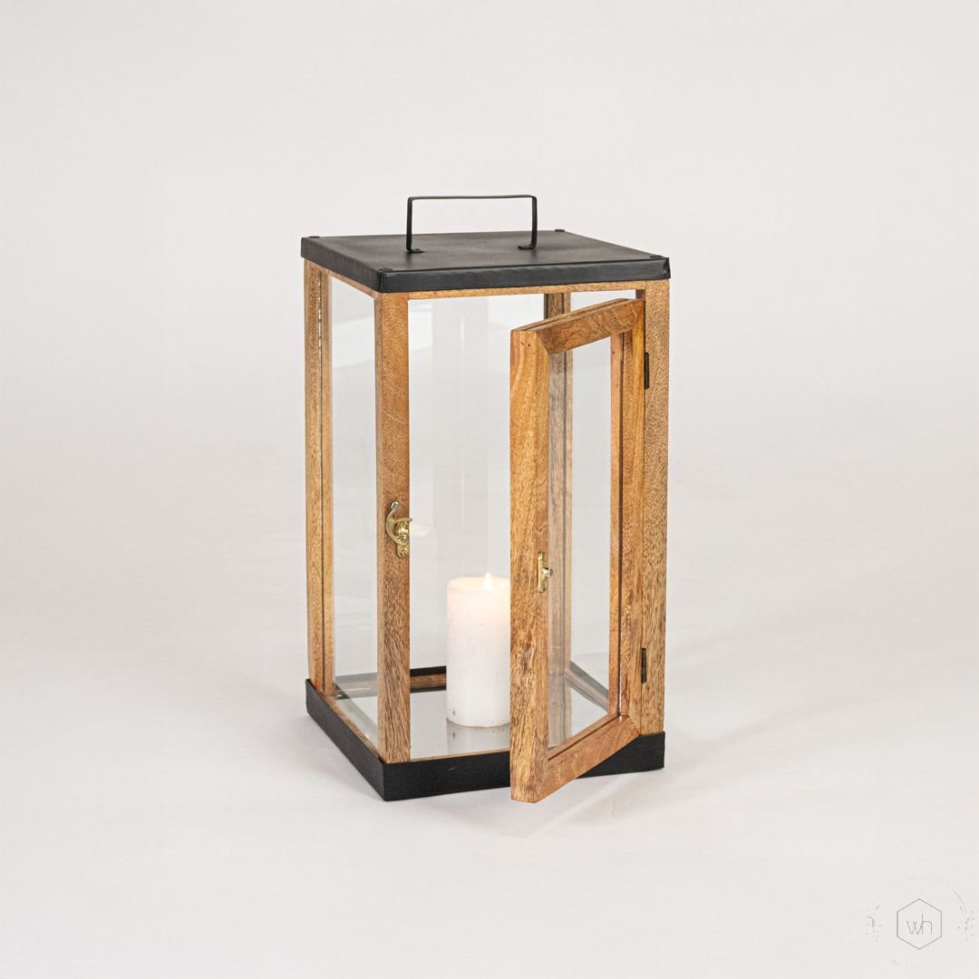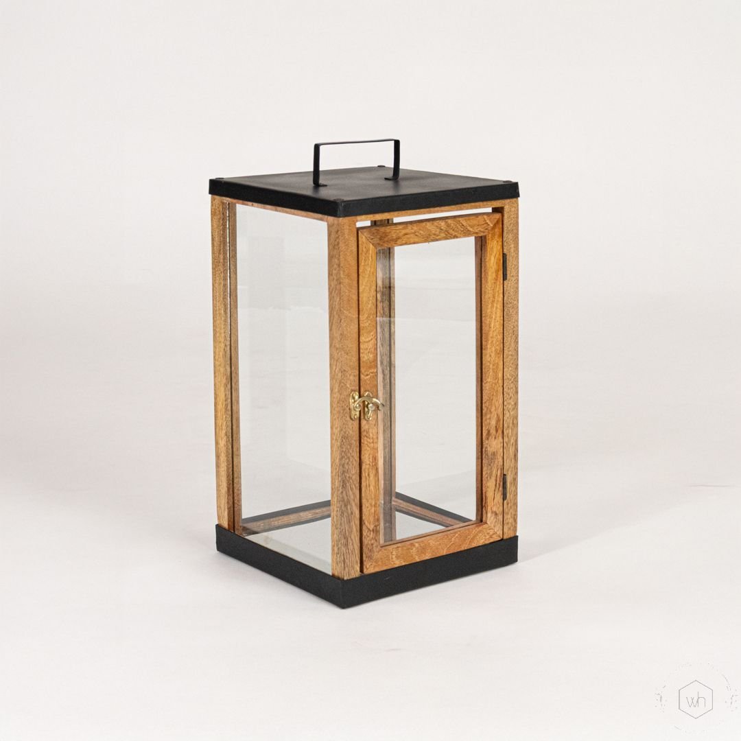 The Ira Wooden Lantern in brown blends rustic craftsmanship with modern grace. Its natural wooden frame paired with glass panels and a matte black top creates a timeless look, perfect for warm, ambient lighting indoors or outdoors.