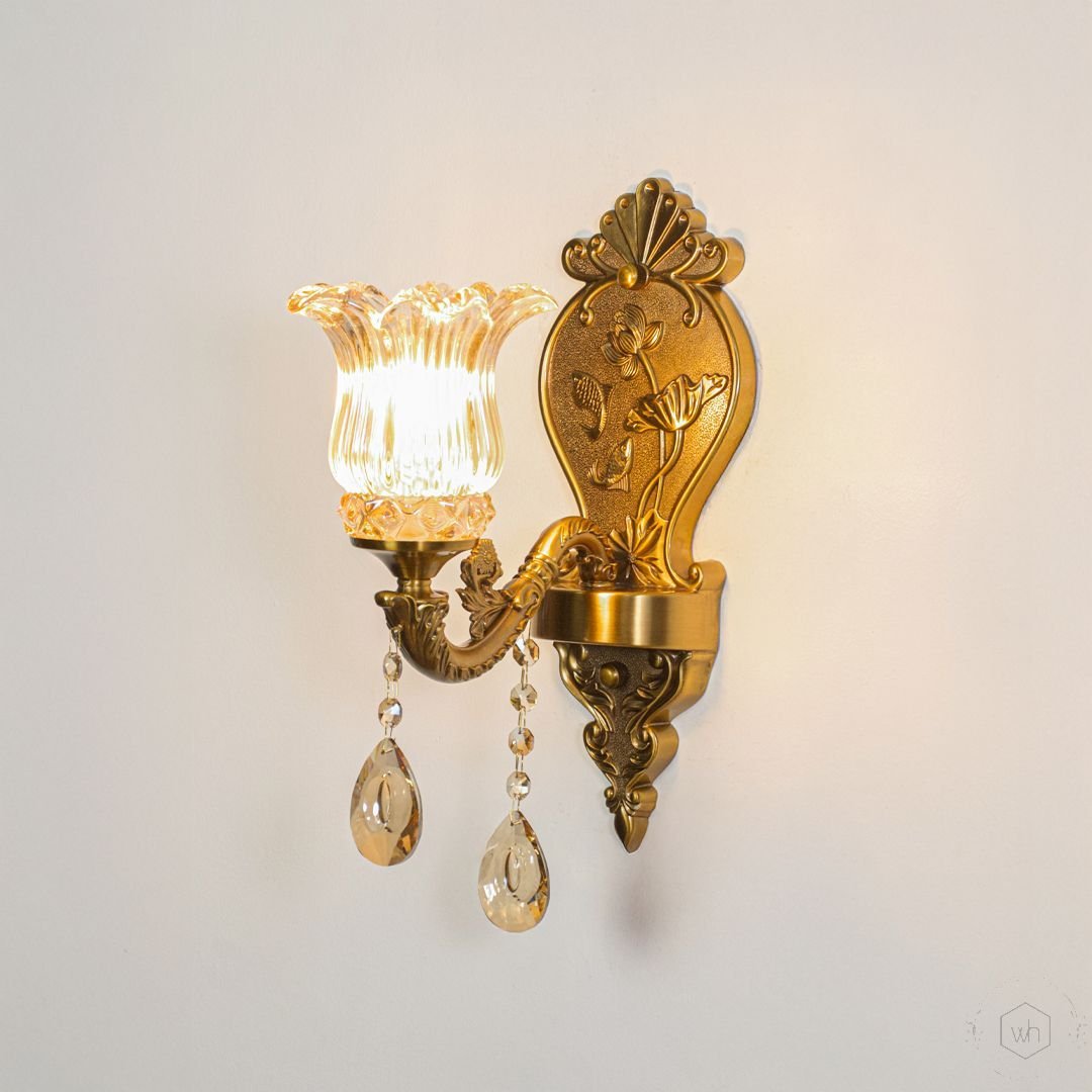 The Lucina 1-Light Crystal Wall Light is a stunning fusion of luxury and classic artistry. Featuring a rich gold-toned metal frame paired with sparkling crystal droplets and fluted glass shades, this wall light creates a warm, radiant glow that elevates any living space with refined elegance.