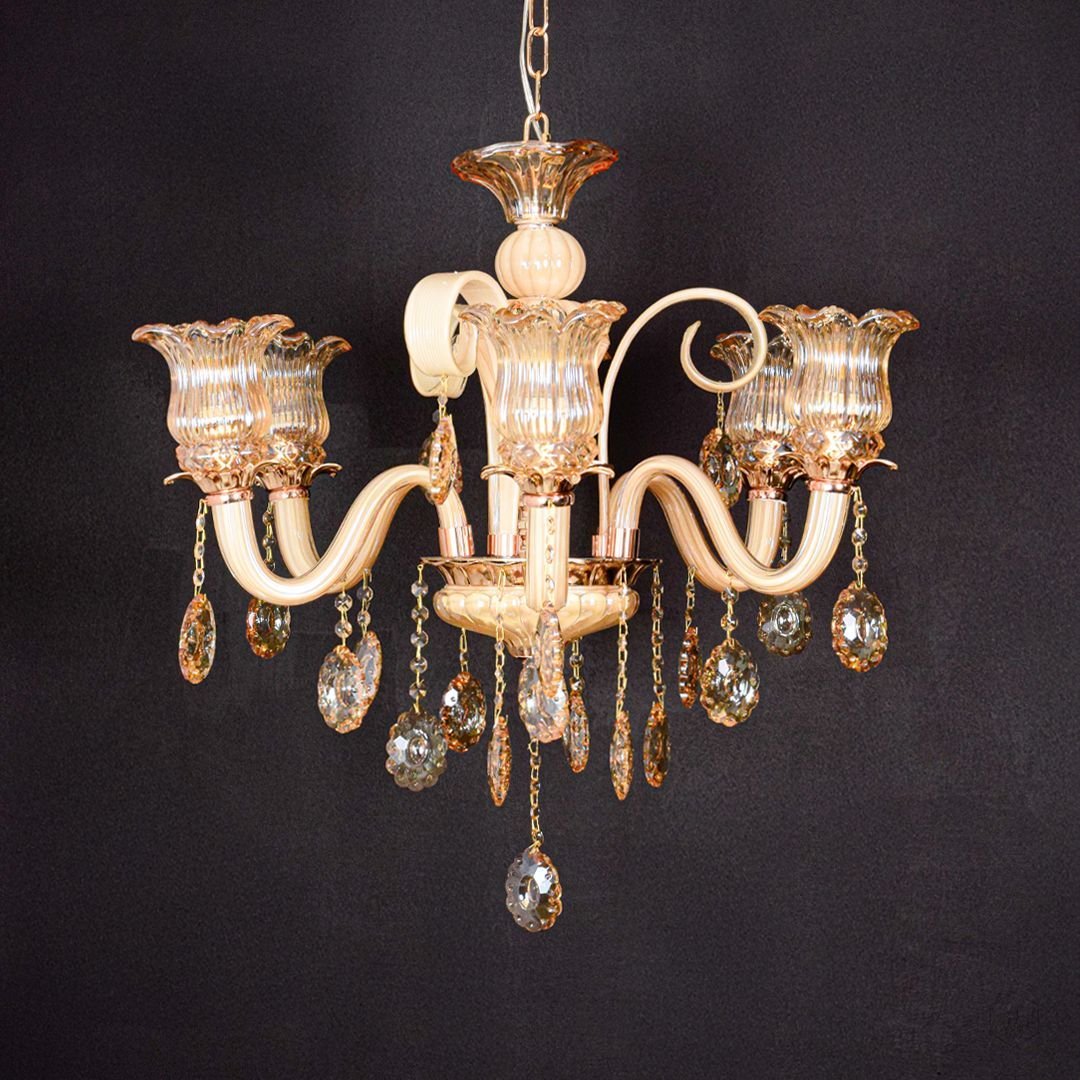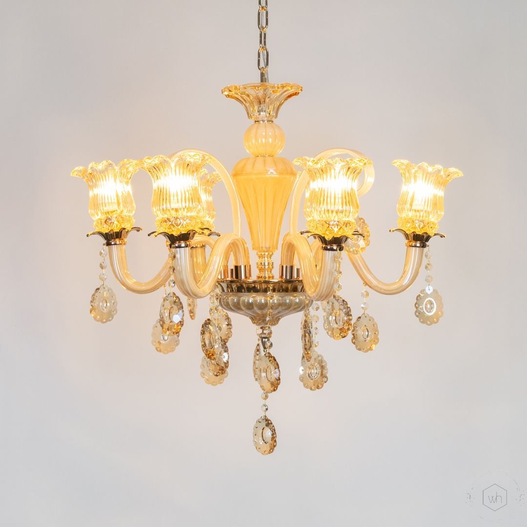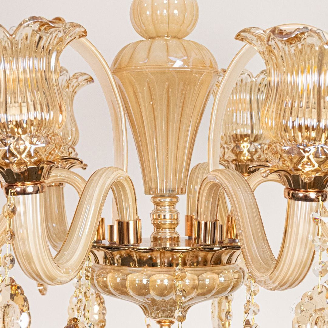 The Regalis Grandeur Crystal Chandelier is a stunning blend of amber-toned glass arms, sparkling crystal droplets, and elegant metal craftsmanship. With its warm glow and intricate detailing, it brings classic luxury and royal elegance to any spacious interior.
