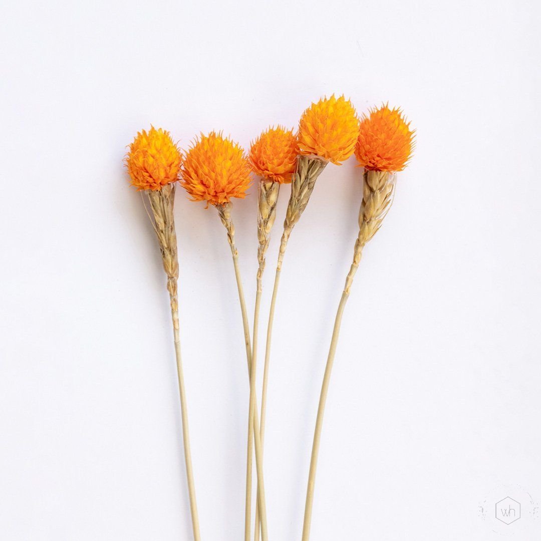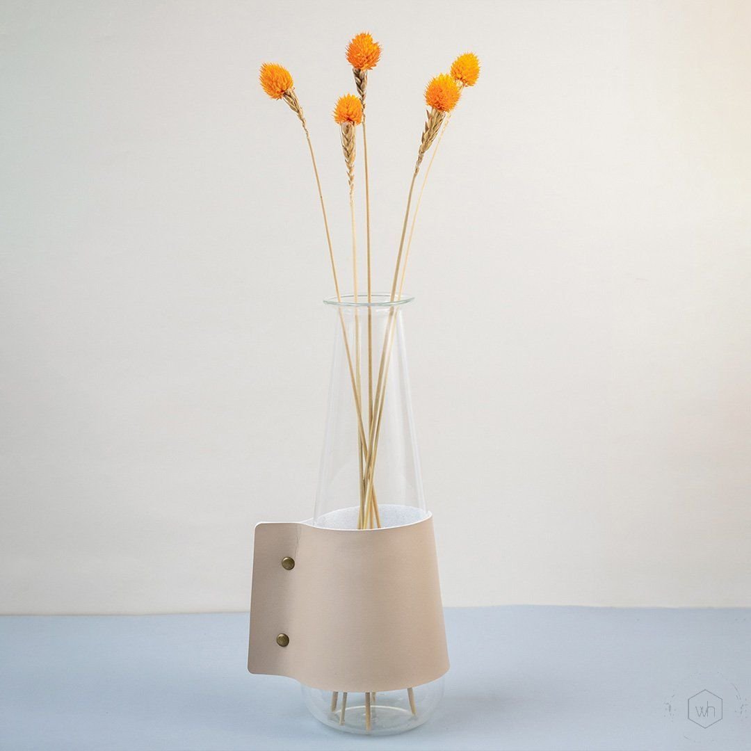 Elevate your space with this simple yet elegant glass vase paired with vibrant yellow pom-pom stems. The transparent body and neutral leather strap provide a sleek base that complements the bright floral elements.